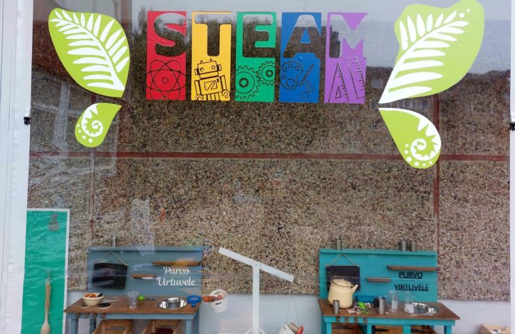 specialistė Graciana Jagello. Simbolinę STEAM laboratorijos juostelę perkirpo ugdymo įstaigos direktorė Eliza