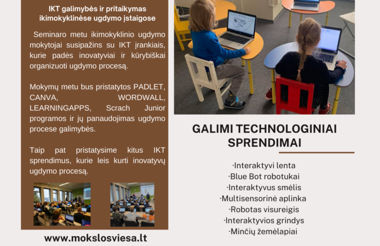 Lapkričio 30 d. socialiniai partneriai VšĮ „ Mokslo šviesa“ supažindino mūsų įstaigos pedagogus su IKT įrankiais, kurie neabejotinai padės inovatyviau ir kūrybiškiau organizuoti ugdymo procesą. Mokymų metu lektorės Ilona Jucienė ir Gintarė Dzindzalietienė pristatė PADLET, CANVA, WORDWALL, LEARNINGAPPS, Scrach Junior programas ir kitus IKT sprendimus, jų panaudojimo galimybes ugdymo(-osi) procese.