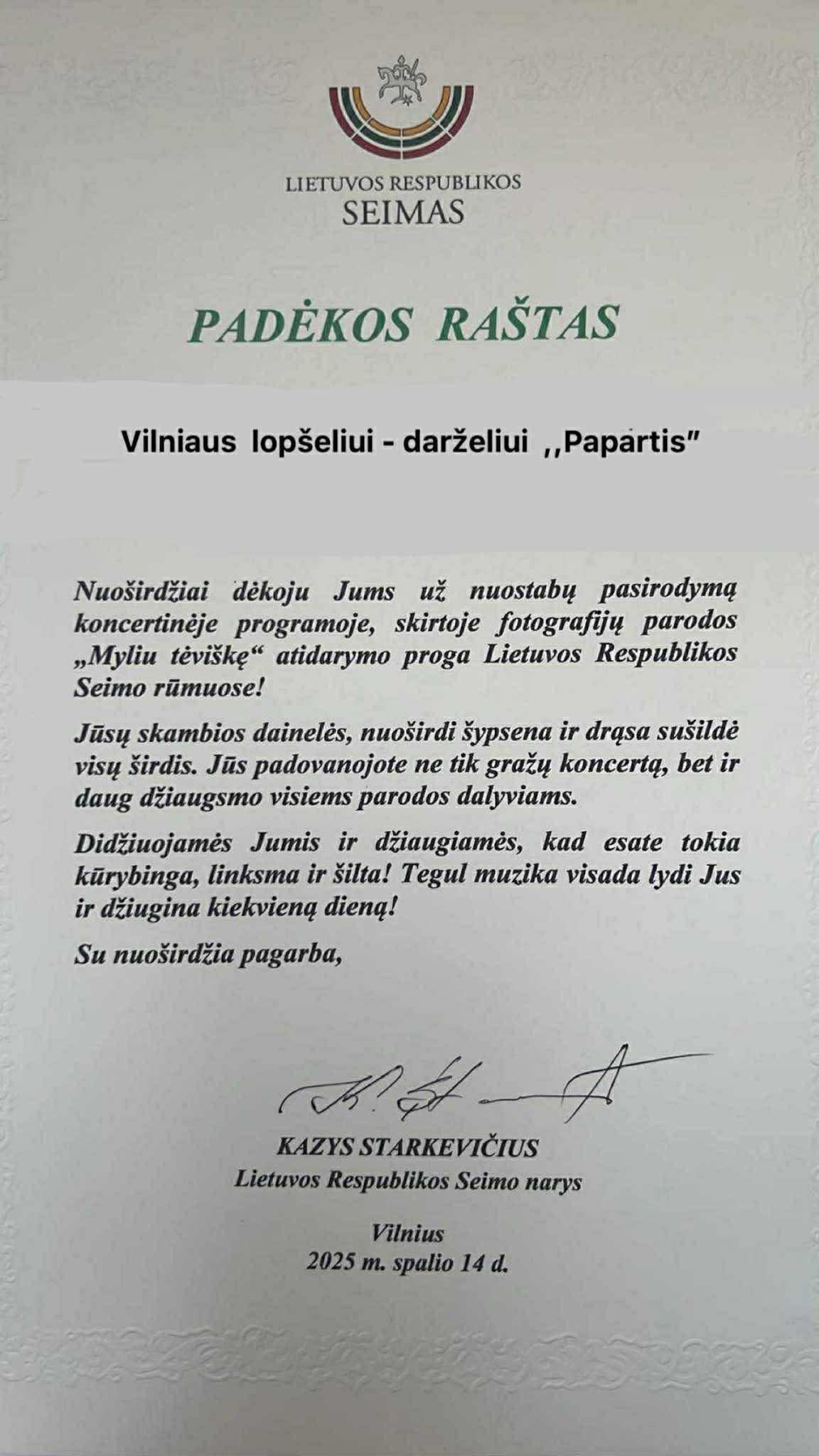 Mūsų vaikučiai buvo pakviesti į Lietuvos Respublikos Seimą su muzikiniu pasirodymu! Didžiuojamės jų drąsa, talentu ir nuoširdžiu dainavimu, kuris pripildė salę šilumos ir džiaugsmo.