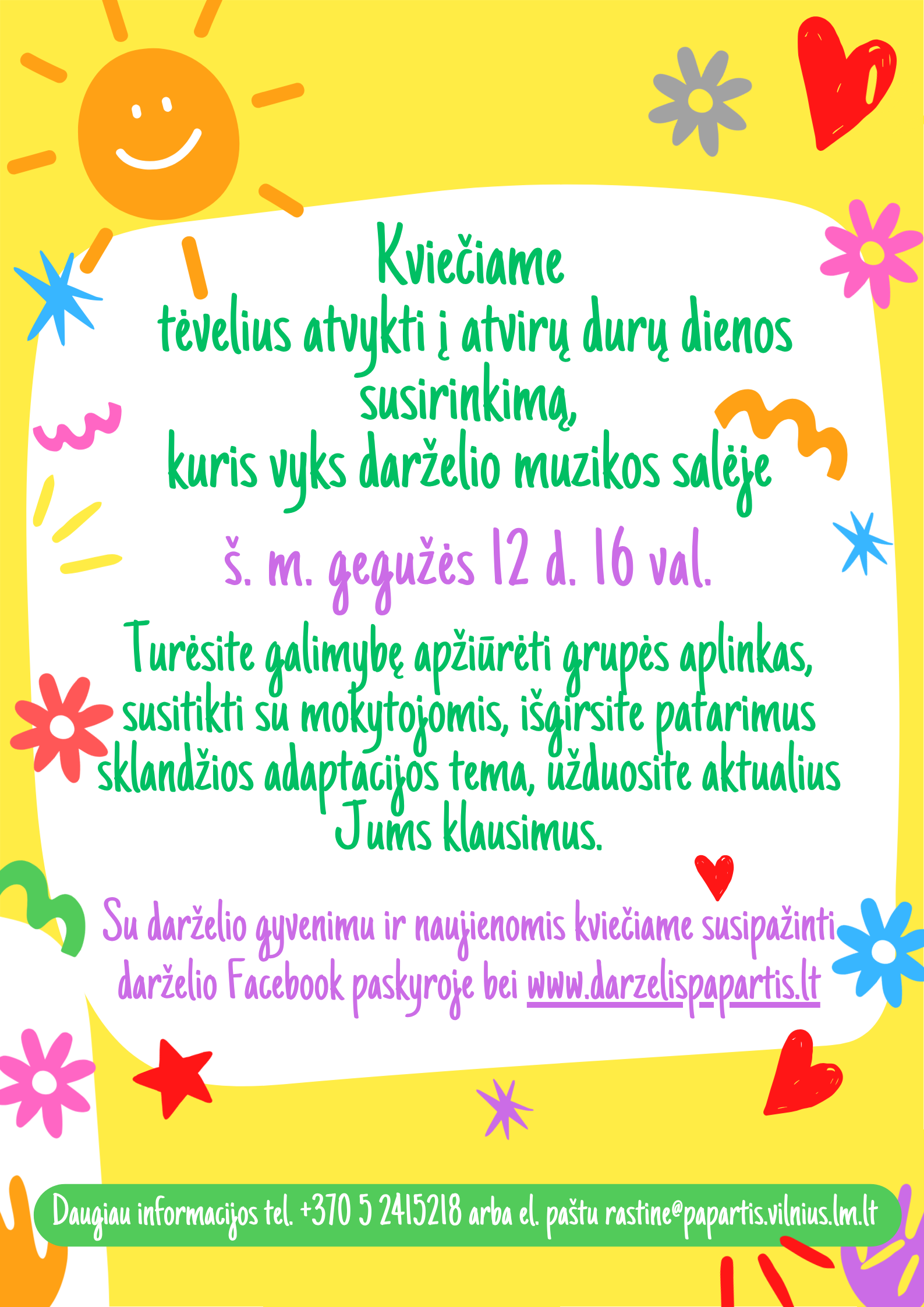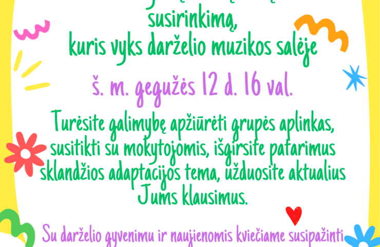 Turėsite galimybę apžiūrėti grupės aplinkas, susitikti su mokytojomis, išgirsite patarimus sklandžios adaptacijos tema, užduosite aktualius Jums klausimus.