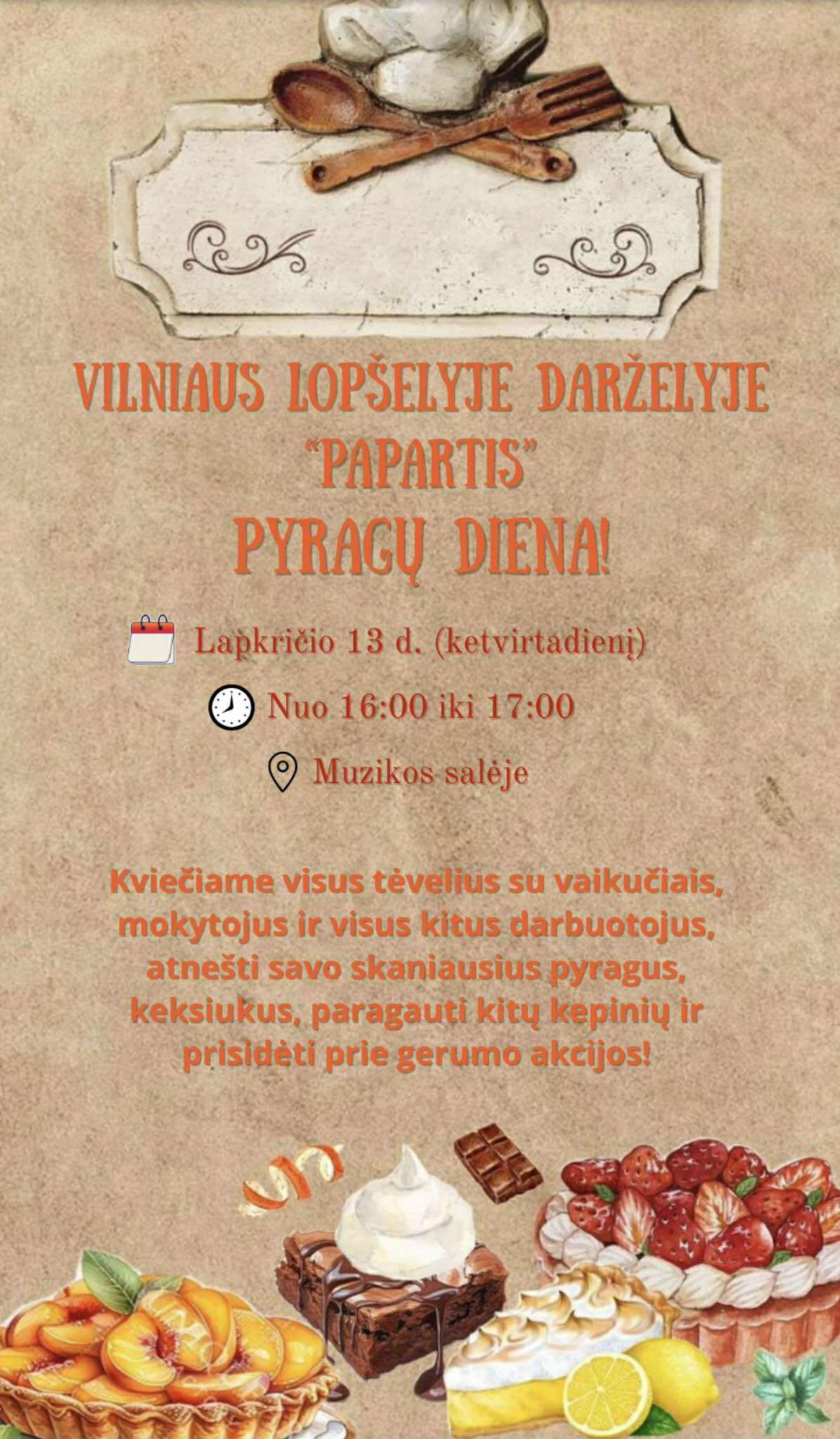 Mūsų darželį užliejo ne tik gardūs kvapai, bet ir didelis bendruomeniškumo jausmas. Pyragų diena tapo gražiu priminimu, kad kartu galime nuveikti daug daugiau, nei atrodo iš pirmo žvilgsnio. Nuoširdžiai ačiū kiekvienam – tėveliams, vaikams, pedagogams ir visai darželio bendruomenei – kurie kepė, ragavo, dalinosi ir prisidėjo. Dėka jūsų gerumo ir šilumos bendruomenė surinko 856 eurus,